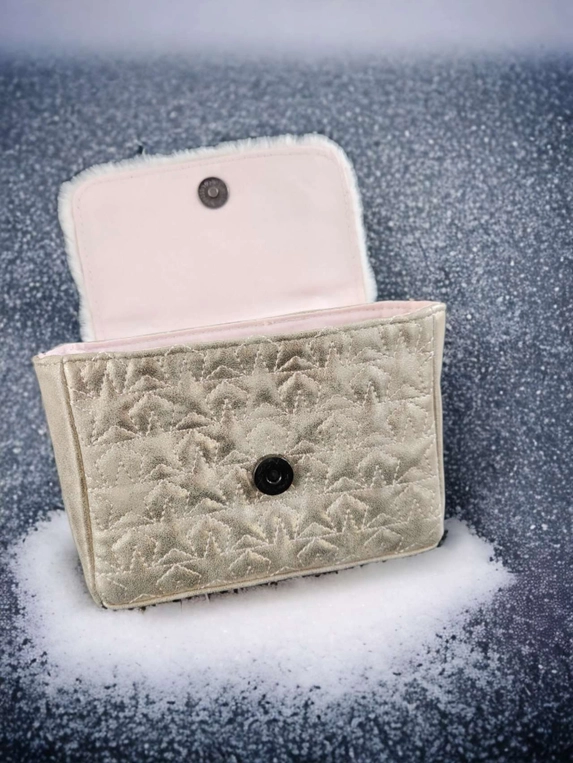 -Made of gold, recycled PU in star pattern all over embroidery at the front with soft ecru colour faux fur flap.