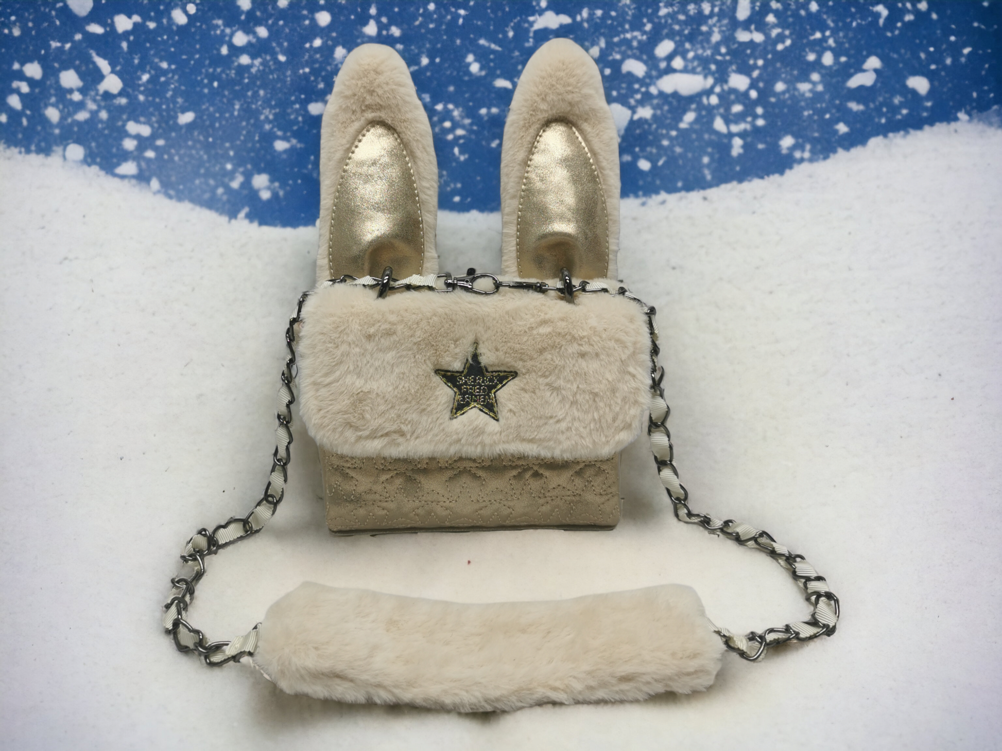 -Iconic crossbody bag in bunny version, with flap and star patch with magnetic clasp.